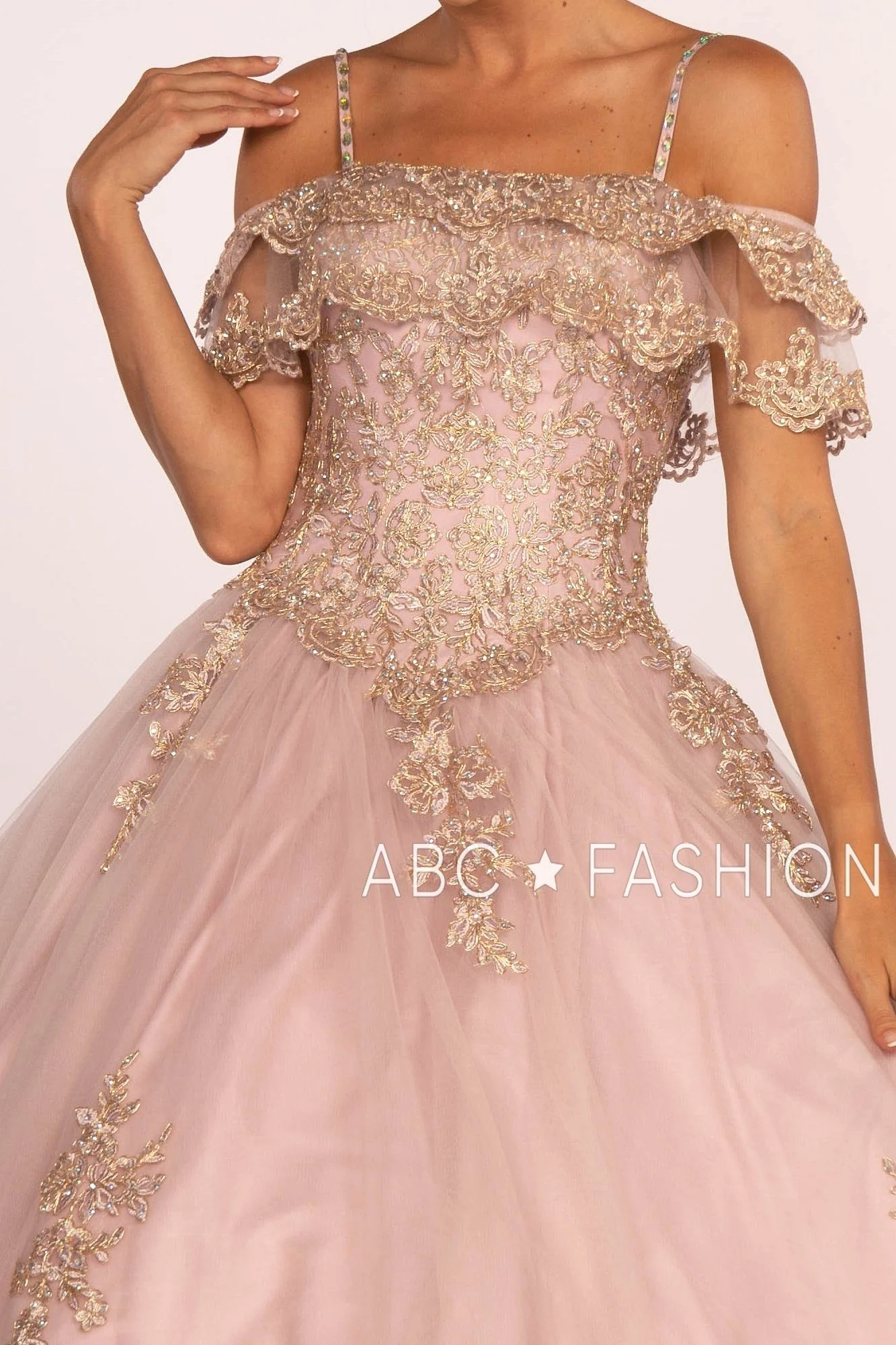 Look unforgettable in this long cold shoulder dress with gold lace appliques by Elizabeth K GL2510. This beautiful cold shoulder gown features a straight across neckline adorned with dazzling beaded gold lace appliques, a flirty open back, the floor length A-line skirt is embellished with embroidered lace appliques, and a lace-up corset back.